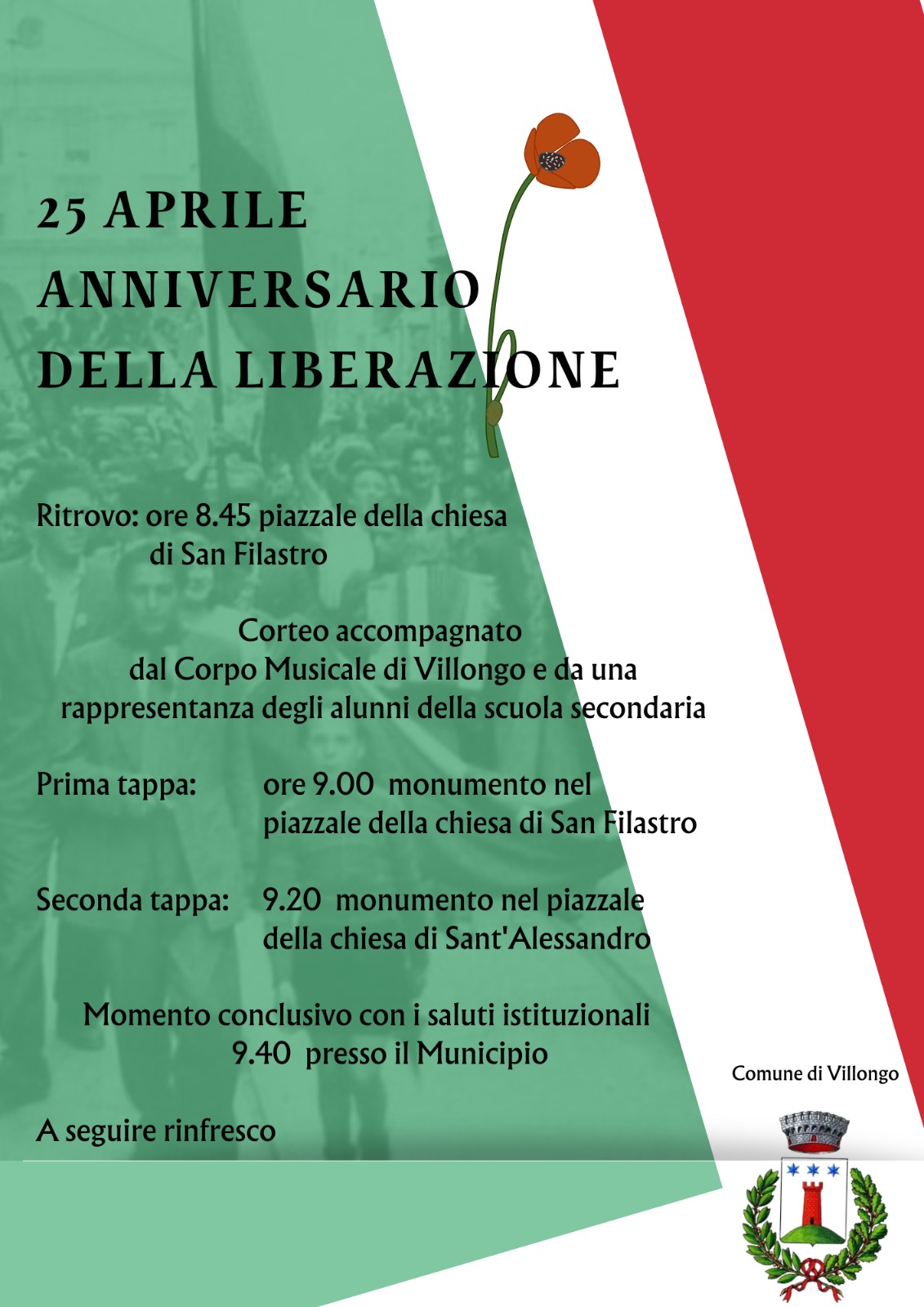 In occasione dell’Anniversario della Liberazione, il Comune di Villongo è lieto di invitare tutte le associazioni e i cittadini a partecipare alle celebrazioni che si terranno giovedì 25 aprile.